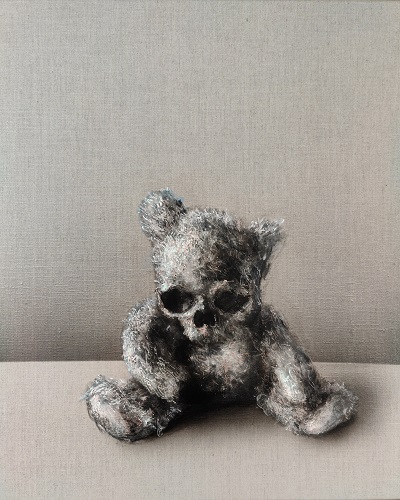 Alors c’est vrai que je suis un peu monomaniaque du crâne. Sinon je travaille le portrait quand j’ai besoin d’exprimer quelque chose de plus violent avec plus de lâcher prise. Mes autres lubies picturales sont très liées à l’enfance, c’est la pop culture, Simpson en tête et les ours en peluche.