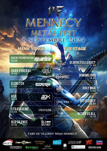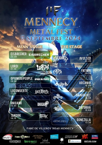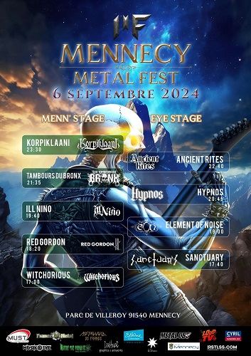 En effet, ce premier week-end de septembre 2024, s’est tenue la 12ème édition du Mennecy Metal Fest, un festival de metal de taille modeste mais à la programmation d’une grande qualité et où tous les styles de metal ont leur place. En effet, ce festival a vu passer du beau monde : Kreator, Paradise Lost, Moonspell, At The Gates, Phil Campbell and the Bastards Sons, Rotting Christ, Corroner, Loudblast, Napalm Death, Septic Flesh, Dark Tranquility, Dagoba, … mais également beaucoup de groupes moins emblématiques mais tout aussi passionnés. Depuis 2021, le festival se déroule en extérieur sur trois jours avec deux scènes, la « Menn’ Stage » et la « Eye Stage », où les groupes se succèdent en alternance.