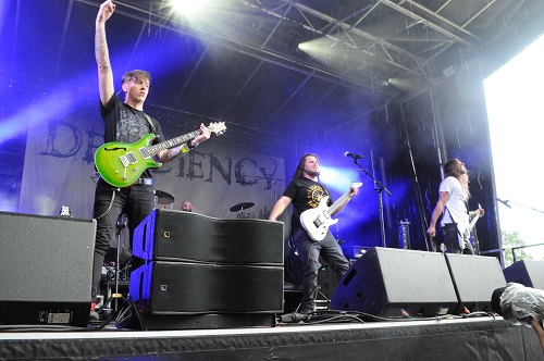 L’espace du parc de Villeroy se remplit doucement pour assister à la prestation de Stratageme. Le groupe de Heavy metal francilien ravit les afficionados du genre et, à la place du fréquent Wall of Death, nous offre un très émouvant Wall of Bisous. Ils ont bien réchauffé l’atmosphère et ont attiré une bonne partie du public. Ceux qui aiment le son plus musclé s’avance déjà vers la seconde scène pour voir les thrasheux de Deficiency. Mais malheureusement ils sont desservis par la météo, qui était plutôt agréable jusqu’ici, et font une bonne partie de leur set sous des trombes d’eau.