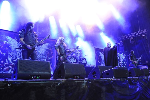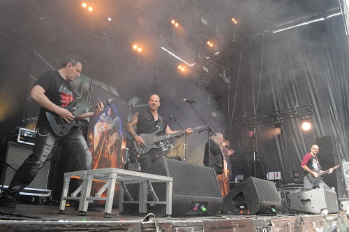 A peine le concert d’ADX fini que la pluie se remet à tomber pour accueillir le blackened thrash de Holy War. En effet la météo a décidé de bouder ce qui n’est pas heavy aujourd’hui. Le public ne se presse pas devant la scène mais essaye de se trouver une place à l’abri car ce sont des trombes d’eau qui accompagnent la guerre sainte se déroulant sur la Eye’ Stage. Qu’on aime ou qu’on n’aime pas, les musiciens ont beau se donner comme de beaux diables, ils ne sont malheureusement pas supportés à la hauteur de leur dévouement.