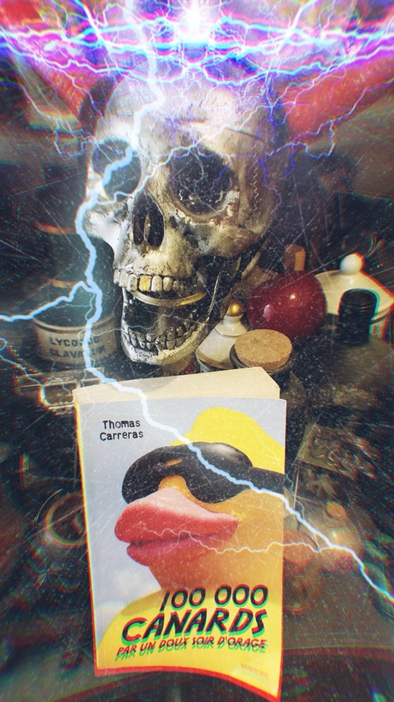 EN résumé, il te faut lire 100 000 CANARDS par un doux soir d’orage, pour trois raisons principales : la première, c’est que ce roman casse bien trois pattes à un canard, la deuxième c’est qu’il m’est très plaisant de penser que, la prochaine fois que tu croiseras le chemin du petit canard vibrant soigneusement planqué dans ton tiroir, c’est mon image qui viendra à ton esprit (mwwarrrr !!!) et la dernière, c’est bien sûr, qu’une fois encore, Satan va t’en boucher un petit coin-coin.
