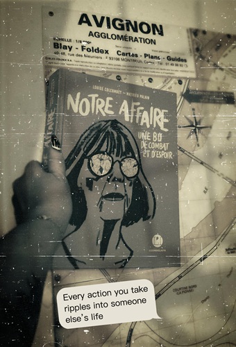 Et puis, un jour, dans une vitrine, mon œil a été happé par une couverture rose, ton visage dessiné en gros plan ; dans tes lunettes, le reflet de l’assistance de la salle du tribunal peut-être. Ce livre, ou plutôt cette bande dessinée, c’est « Notre Affaire ». Je ne pouvais pas ne pas pousser la porte de cette librairie. Arrivée à la maison, j’ai ouvert l’ouvrage et j’ai lu. Deux journalistes ont réuni 23 artistes pour retracer ton affaire mais pas seulement. Il remonte aussi aux origines de la domination masculine, de la banalisation du viol, du silence, de la honte, et enfin du regard qui change. Je t’invite lectrice, lecteur, à te replonger le temps d’une lecture dans ce terrible procès, tout ce qu’il nous a raconté et tout ce qu’il a soulevé.