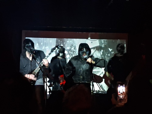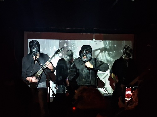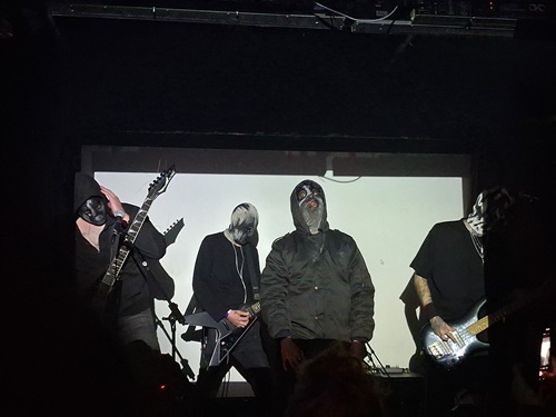 A l’affiche, on a WOEST, un groupe d’indus black metal, au look peu rassurant, leurs cagoules me rappellent un peu celles de Rorschach des Watchmen, la batterie est programmée, en fond il y a une toile cinématographique. La scène reste un peu juste pour notre quatuor, je ne suis pas certain qu’il y aurait eu la place de mettre une batterie. Niveau lights, on est très light, le groupe n’est éclairé que par les extraits noir et blanc des films projetés ; on reconnaitra parmi tant d’autres, Hellraiser, Lost Highway et, j’ai un doute, Cannibal Holocaust. Assez parlé de l’ambiance très intime créée par tous ces éléments, parlons du set que le groupe nous a concocté. Ce qui est bien avec les groupes d’indus, c’est qu’ils ne perdent de temps en bla bla entre les titres, ça s’enchaine, aucun temps mort, malgré le volume plutôt élevé, on dépasse souvent les 100 décibels, le son est très correct.